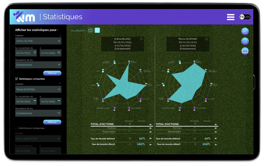 L’utilisateur qui accompagne le gardien peut saisir et modifier en temps réel ou en différé tous les éléments liés aux actions impliquant le gardien de but de football, et ce sur les plans défensifs et offensifs, et en prenant en compte les dimensions :